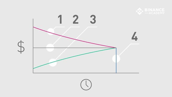Особенно полезными указанные два явления оказываются при использовании расчетного типа. На представленном ниже рисунке из Binance Academy (портал, изучив который неопытный биржевик узнает, как правильно торговать фьючерсами на Бинансе) описанные ситуации показаны на графике, где 1 и 3 — контанго и бэквордация, соответственно, 2 — ожидаемая котировка спота, 4 — момент экспирации. На этом портале размещено много полезной информации об используемых индикаторах технического анализа и других аспектах функционирования деривативной площадки и обращающихся на ней инструментах, в том числе базовых вопросах, как закрыть сделку с профитом и как выставлять ордера различного типа.