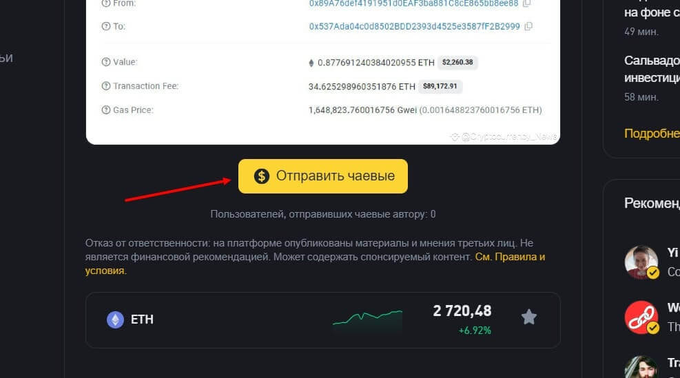 При желании отблагодарить автора за полезный или интересный контент, пользователи могут перевести ему определенную сумму в криптовалюте, выбрав символическую сумму в соответствующем меню под публикацией. Чтобы получать чаевые, необходимо иметь более 1000 подписчиков. Для того чтобы отправить автору вознаграждение, нужно: