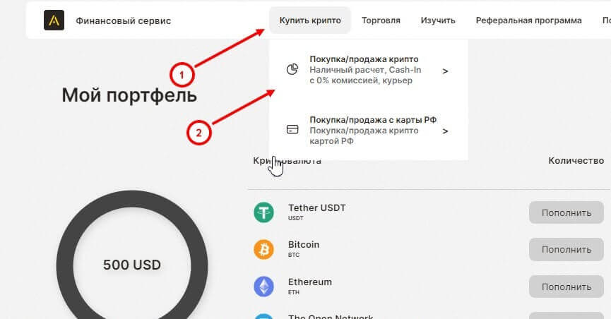 Если планируете пополнить с помощью фиата, то в таком случае доступен P2P маркет, где можно приобрести крипту за наличные в офисах партнеров или курьером, картой и cash-in на расчетный счет в банках. Для пополнения нужно навести мышкой на “купить крипто” и нажать на “покупка\продажа за фиат”.