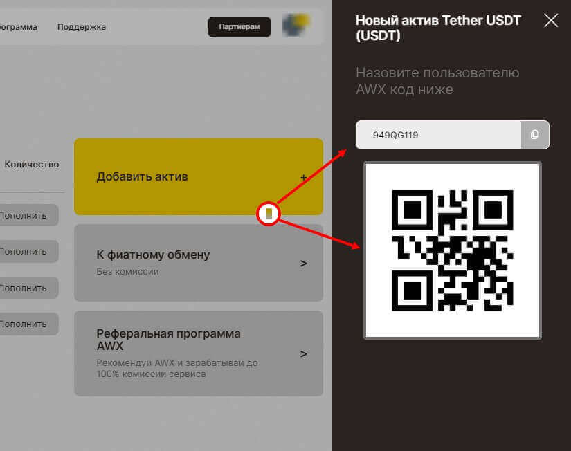 Откроется код пользователя AWX, который нужно будет предоставить тому, кто планирует отправить монеты внутри платформы. Также можно воспользоваться QR кодом.