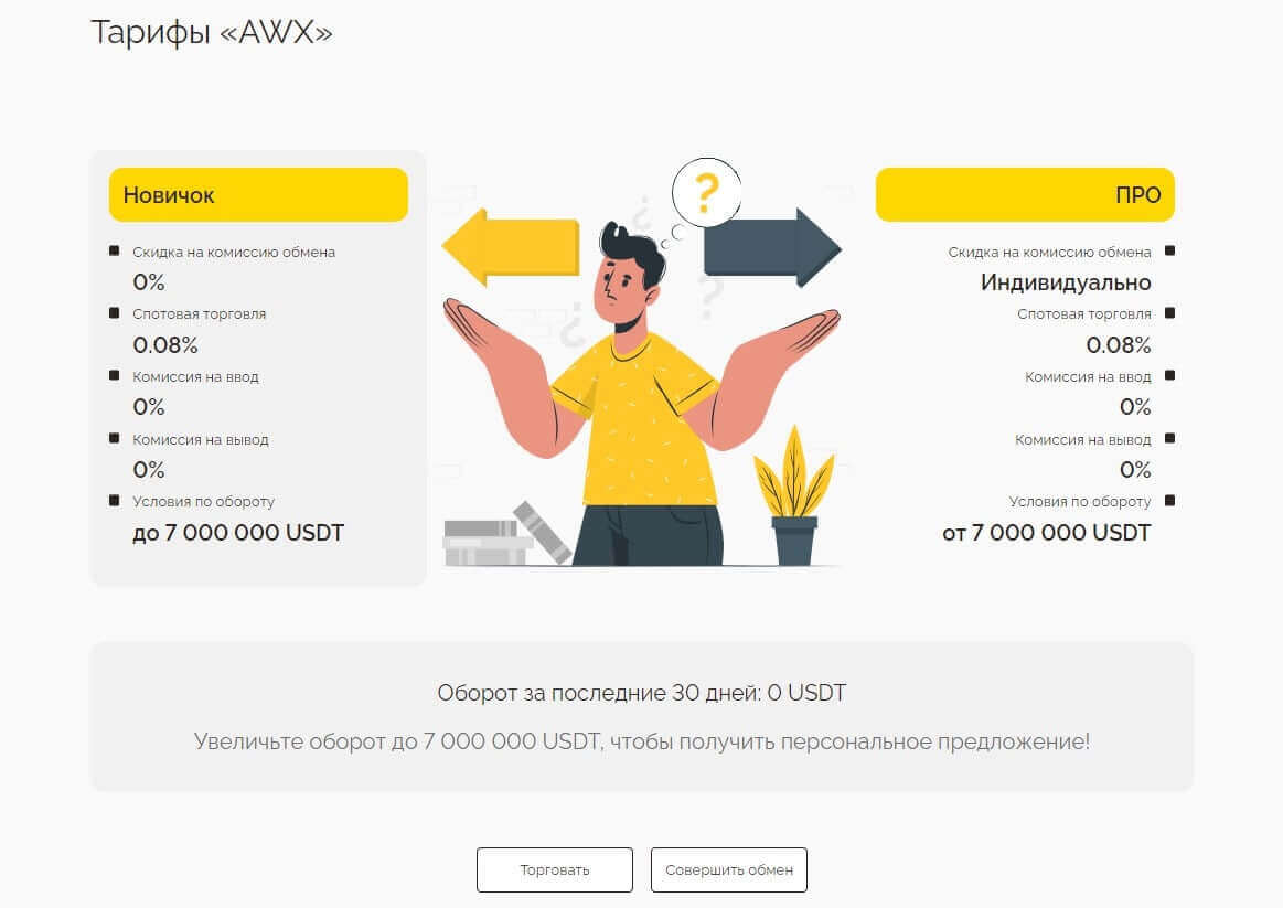 Торговая платформа AWX – централизованная площадка, предлагающая покупать ил продавать криптовалюты, выполняя две функции: торговля на спотовом рынке и криптообменник с офисами в некоторых городах России и мира. Основана криптовалютная биржа в 2018 году под названием AWEX, которая развивала собственный клиентский сервис.