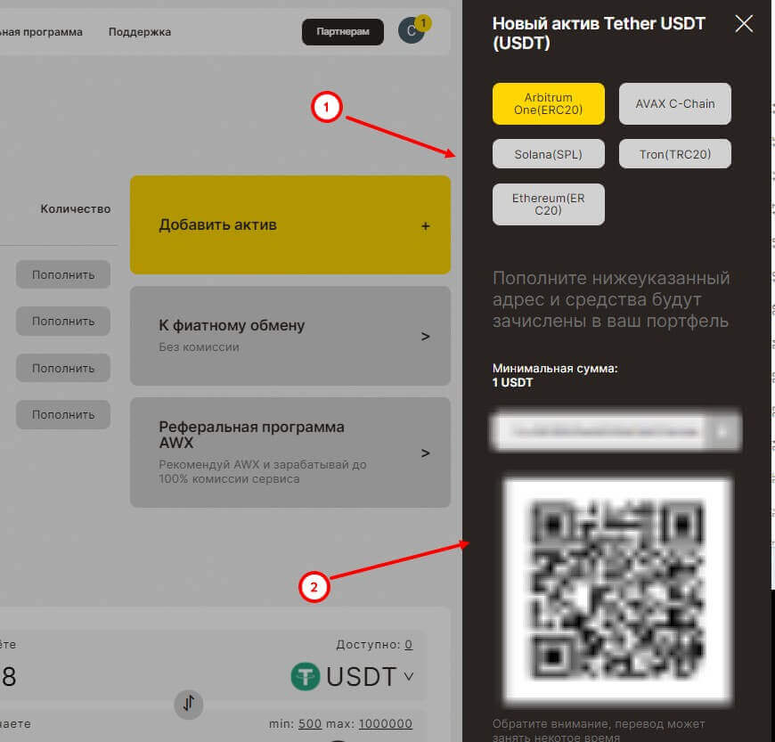 Выберите сеть (доступны Arbitrum, AVAX, Solana, Tron и Ethereum). После этого появится кошелек, на который нужно перевести выбранную криптовалюту.