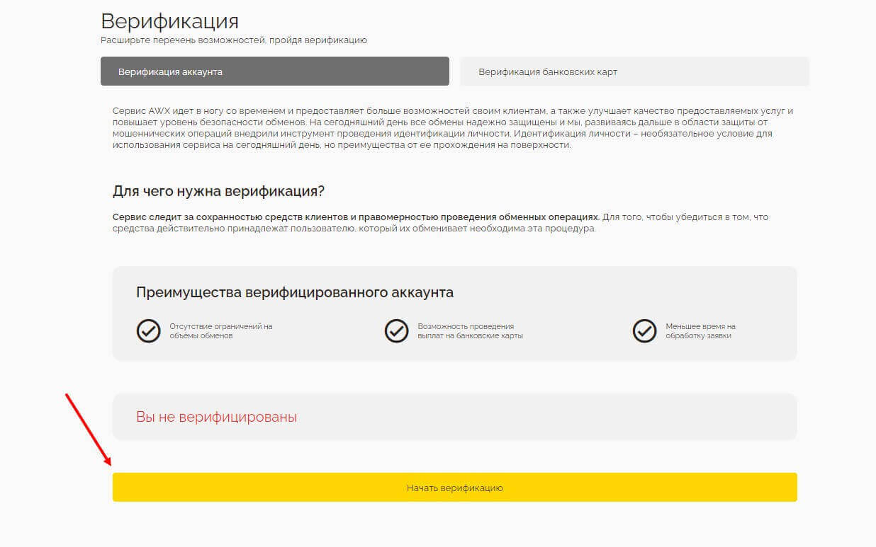В открывшейся странице появится информация о верификации: для чего нужна, преимущества. Чтобы пройти, кликните в нижней части на желтую кнопку “начать верификацию”.