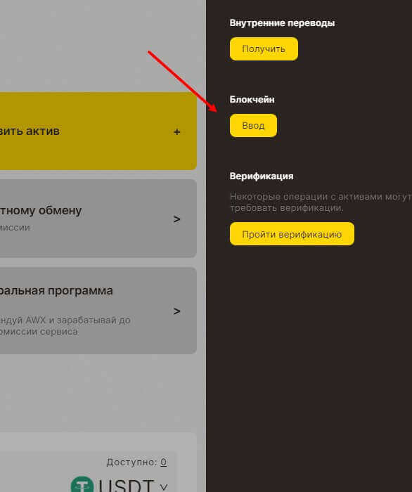 Для пополнения счета с помощью перевода со своего или чужого криптовалютного кошелька, необходимо также войти в ЛК и нажать на кнопку “пополнить”. После этого в разделе “блокчейн” кликните на кнопку “ввод”.
