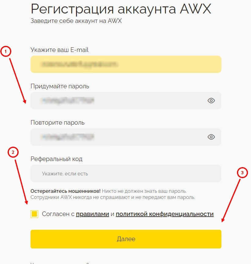 Далее процесс происходит как на других биржах – при регистрации по E mail нужно указать адрес почты и придумать пароль. Также можно указать реферальный код. А затем согласитесь с правилами и нажмите на кнопку “далее”.