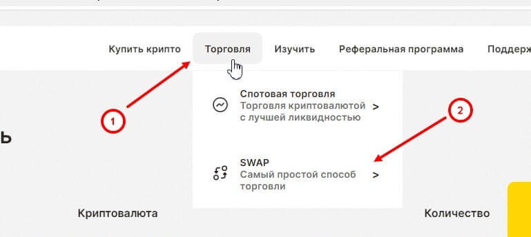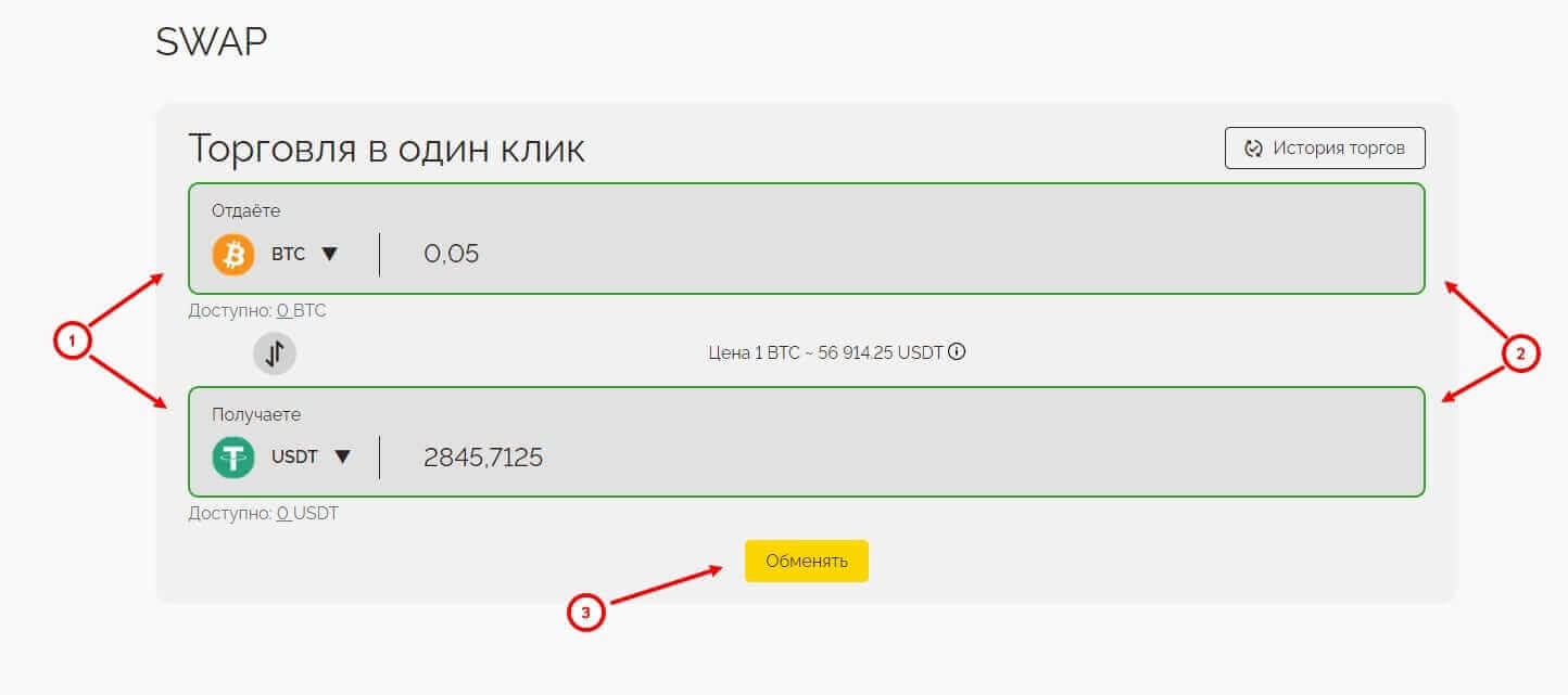 SWAP – раздел, позволяющий приобрести криптовалюту в один клик по рыночной цене на момент совершения покупки, работая как обменник внутри криптовалютной биржи. Чтобы перейти в него, нужно мышкой навести на раздел “торговля” – “swap” и нажать на последний.