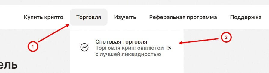 Спотовый рынок – основной вариант торговли, в котором пользователи могут размещать свои ордеры на доступные сервисом криптовалюты. Чтобы перейти в раздел, нужно курсором мышки навестись в верхнем меню на “торговля” – “спотовая торговля” и кликнуть на последний.