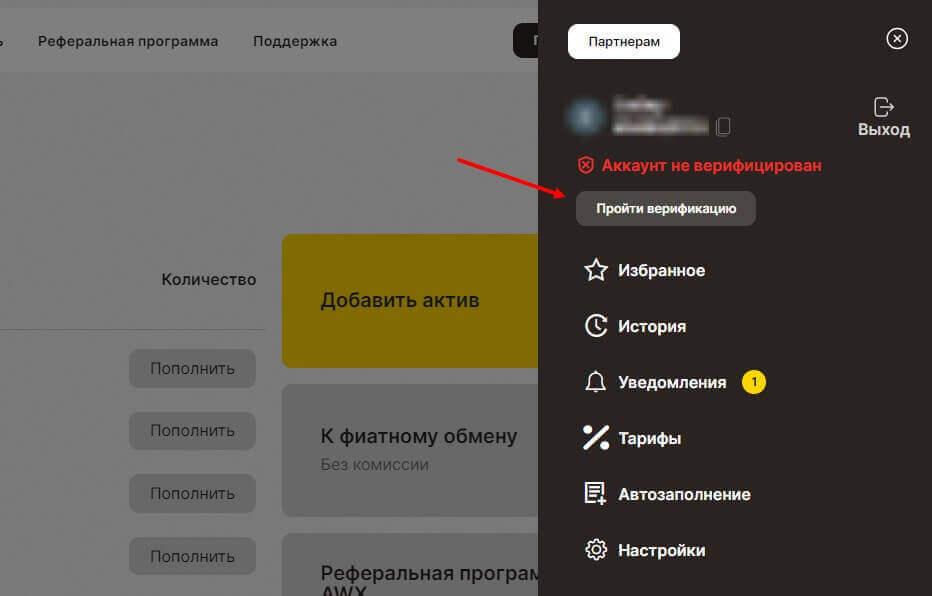 Для определенных операций, а также увеличения лимитов важно пройти процедуру верификации. Чтобы сделать это, необходимо в правой части нажать на иконку с буквой имени пользователя и в открывшемся боковом меню нажать на “пройти верификацию”.