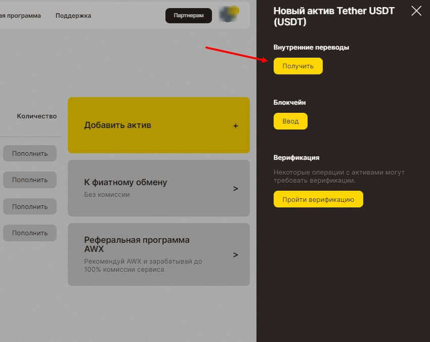 Чтобы пополнить с помощью внутреннего перевода на ваш счет в бирже, необходимо открыть личный кабинет, выбрать криптовалюту и нажать на кнопку “пополнить”.