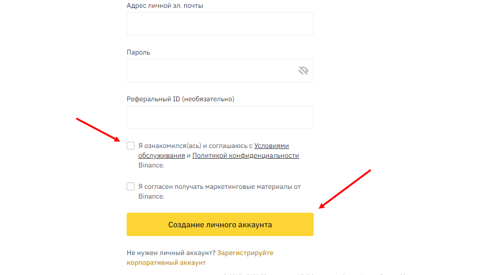 - Откроется новая страница, где вам нужно ввести адрес личной электронной почты, пароль и реферальный код (иногда он заполняется самостоятельно).