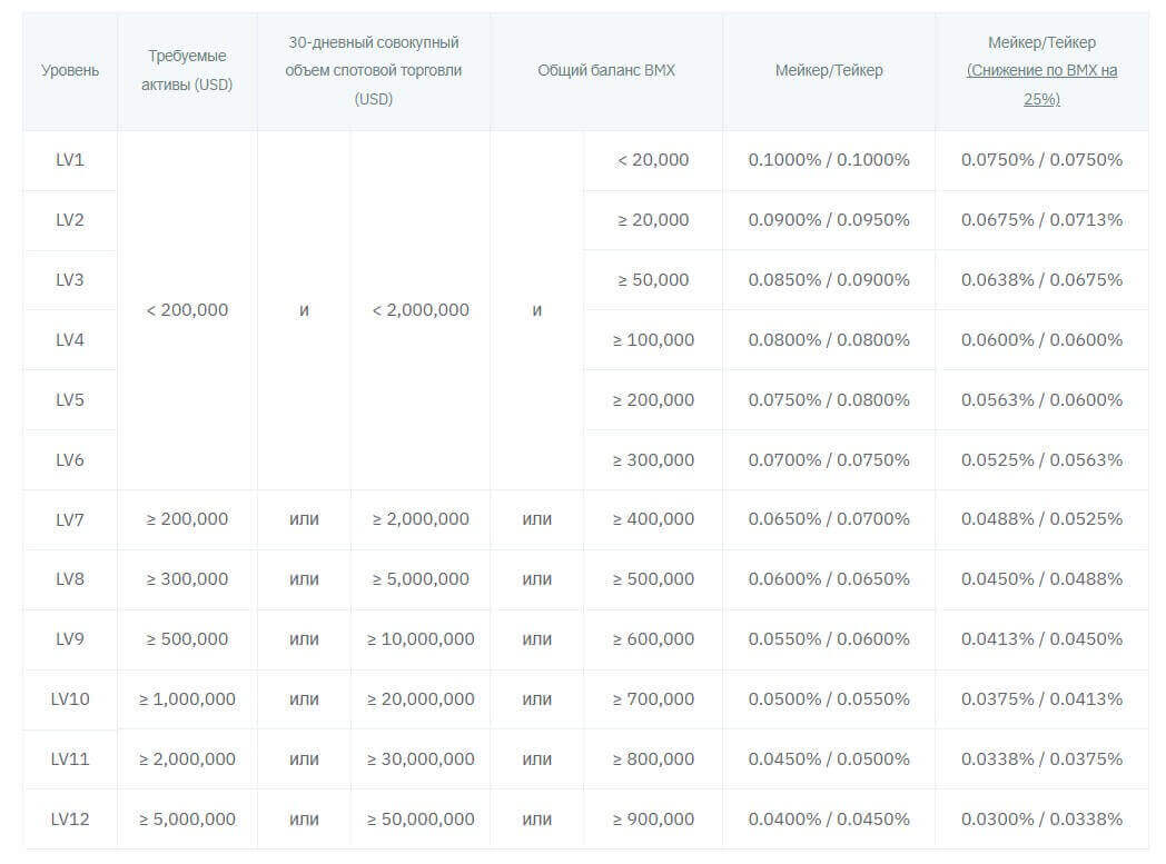 Чтобы принять участие в программе нужно иметь определенное количество BMX на счету до 6 уровня и одно из условий (объем торгов за последние 30 дней, количество активов на счету или количество BMX) с 7 по 12 уровни. Все условия по участию в VIP спотовому рынку и перечень торговых пар, принадлежащих к определенному уровню активов можно увидеть ниже или на официальном сайте на странице “Комиссии”.