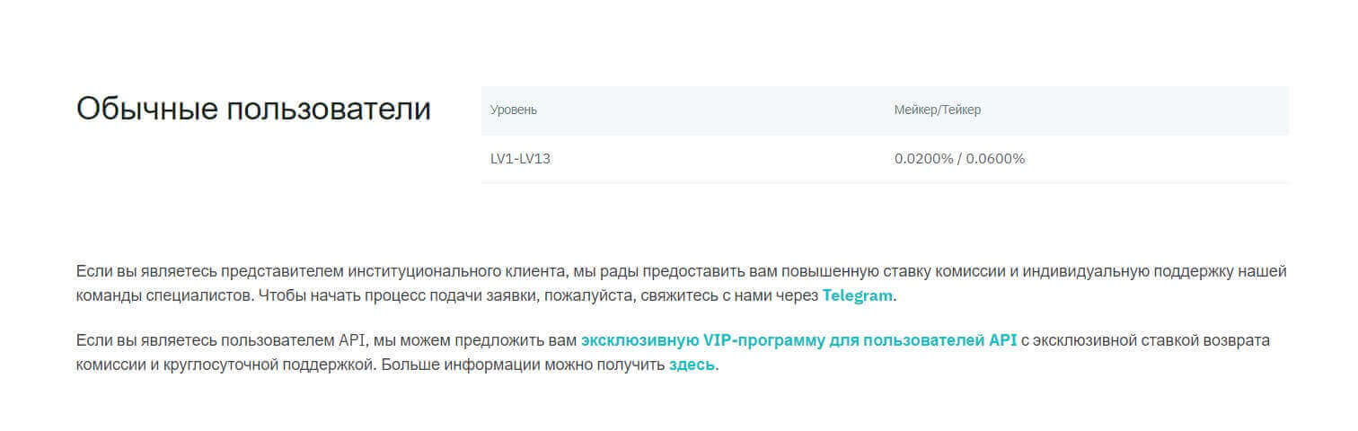 В отличие от спотового рынка на фьючерсном для всех уровней ставка комиссий единая – 0,02% для мейкеров и 0,06% для тейкеров. При этом для институциональных трейдеров компания готова предложить наиболее гибкие условия и поддержку от персонального менеджера – для этого нужно написать в Telegram-аккаунт @BM_Institution.