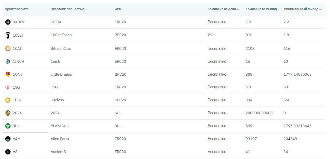 Также на бирже имеется комиссионные за пополнение и снятие криптовалюты с биржи на свой кошелек. При пополнении ставка равняется от 0 (большинство активов) до 10%. На вывод действует фиксированная ставка в зависимости от криптовалюты и сети, например, при выводе Биткоина комиссия равняется от 0,000001 BTC (сеть BTC-Lightning) до 0,00315855 BTC (сеть RUNES).