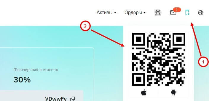 Каждый пользователь может не только торговать на сайте криптовалютной биржи через ПК, но и пользоваться приложениями на мобильном телефоне. Чтобы скачать, необходимо в верхней части страницы навести на иконку с телефонов и отсканировать QR-код.