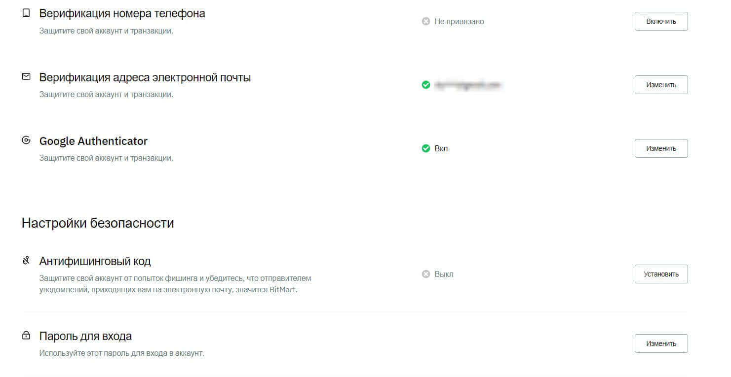 - Безопасность. В этом разделе находятся все меры предосторожности, среди которых верификация по номеру телефона и адресу электронной почты, Google Authenticator, антифишинг код и прочее.