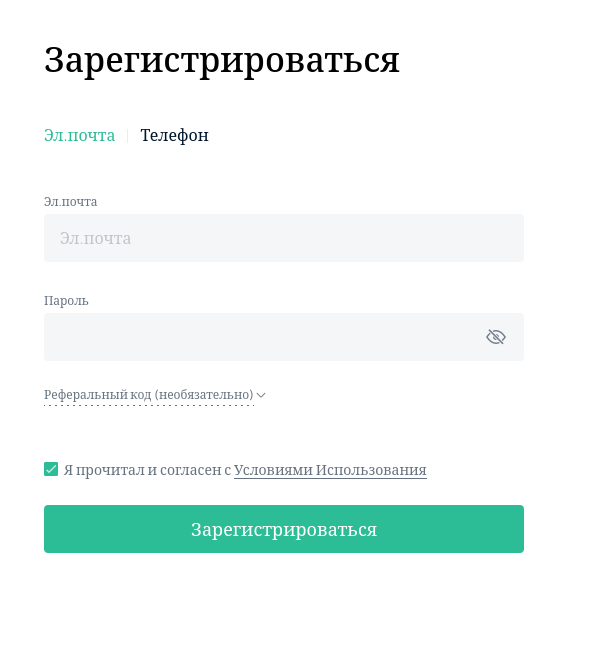 Возможны два пути как зарегистрироваться на официальном сайте — с помощью адреса электронной почты, либо номера мобильного телефона. Опционально вводится реферальный код при создании аккаунта, участвующего в партнерской программе, либо пришедшего с помощью приглашения. Доступны приложения для мобильных устройств, скачать на пк отдельную программу нельзя, для настольных компьютеров предусмотрена только браузерная версия.