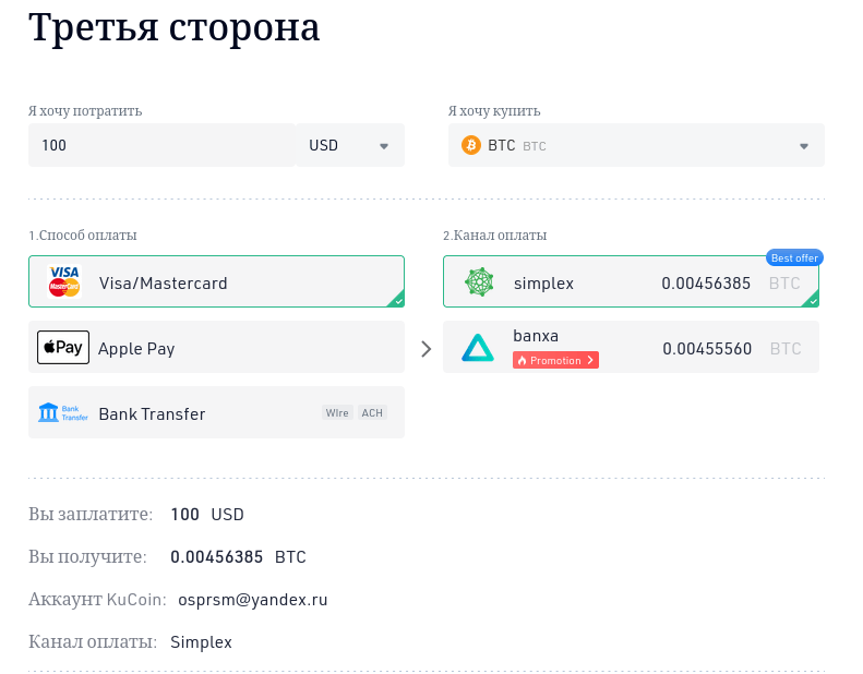 - С привлечением сторонних сервисов, за счет чего можно проводить использовать банковские карты, Apple Pay или банковские платежи для покупки «крипты»