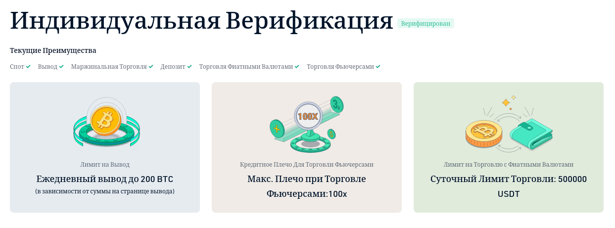 Еще одна существенная рекомендация — произвести верификацию, это поможет снять все существующие ограничения для проведения финансовых транзакций. Для прошедшего проверку KYC открыты следующие преимущества: