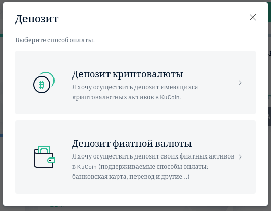При использовании депозитного перевода откроется интерфейс выбора конкретного способа внесения — имеющейся криптовалюты, либо фиата.