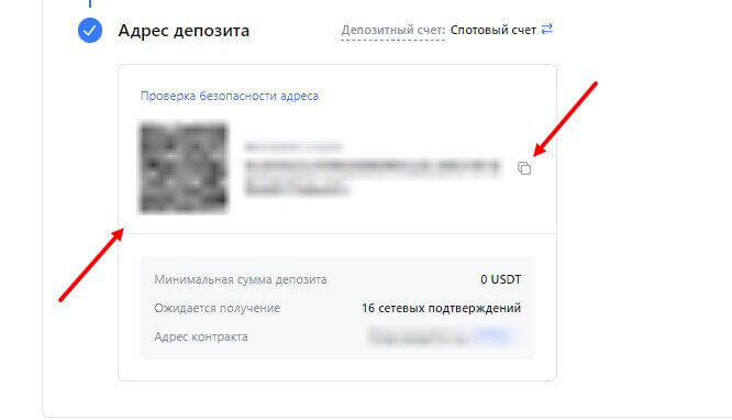 Появится адрес, куда нужно совершить перевод монет – если отправка производится с помощью телефонного кошелька, то в таком случае скопируйте QR-код, в ином же случае скопируйте адрес, нажав на специальную кнопку или выделив значение и вставьте в поле ввода адреса на криптовалютном кошельке.