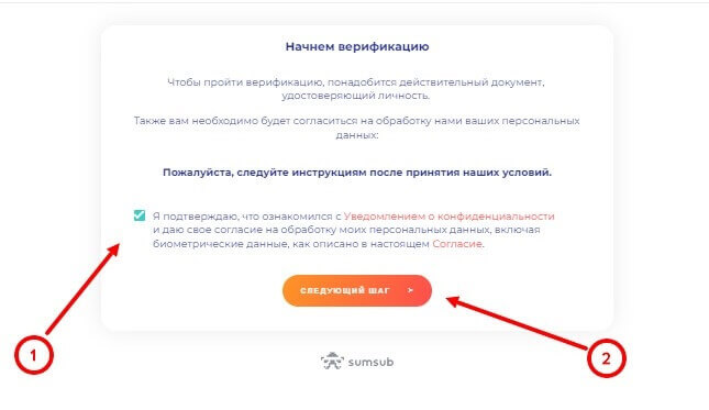 После этого пользователь сможет увидеть страницу, где необходимо будет подтвердить ваше согласие на обработку персональных данных и ознакомление с условиями конфиденциальности. Нажмите на кнопку «Следующий шаг», окрашенную в красно-оранжевый цвет, чтобы продолжить процесс верификации.