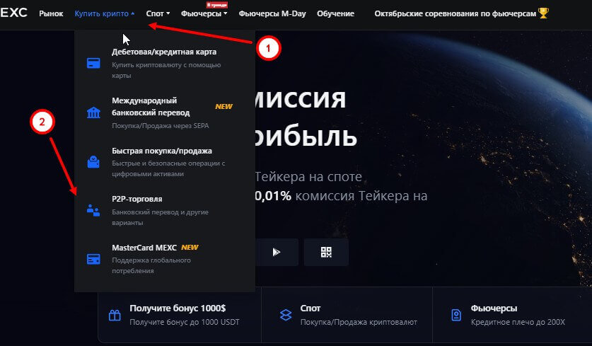 Существует несколько способов пополнить счет на торговой платформе MEXC Global, но не все могут быть использованы для проведения транзакций. Пользователям из России недоступно прямое пополнение счета с помощью банковских карт, однако они могут воспользоваться покупкой через P2P-торговлю и пополнением кошелька биржи с помощью перевода суммы в цифровых активах.