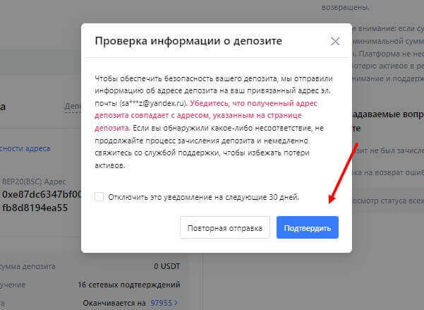 После генерирования адреса, появится окно, где необходимо подтвердить информацию о депозитном кошельке на электронный адрес почты, откройте почту, и если указано все правильно, то нажмите на кнопку “Подтвердить”.