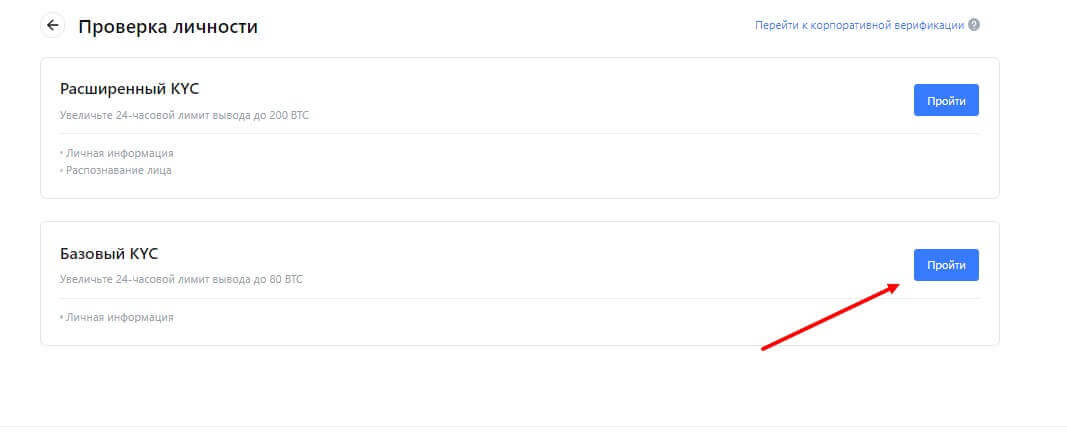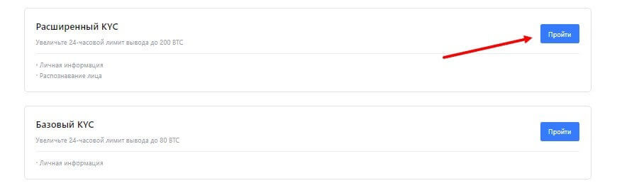 Для увеличения суточного лимита вывода средств до 80 BTC пользователю следует пройти пункт «Базовый KYC» на новой странице и нажать синюю кнопку. В процессе прохождения этого пункта, будет требоваться предоставить минимальное количество документов, что повысит лимит в 2,6 раза.