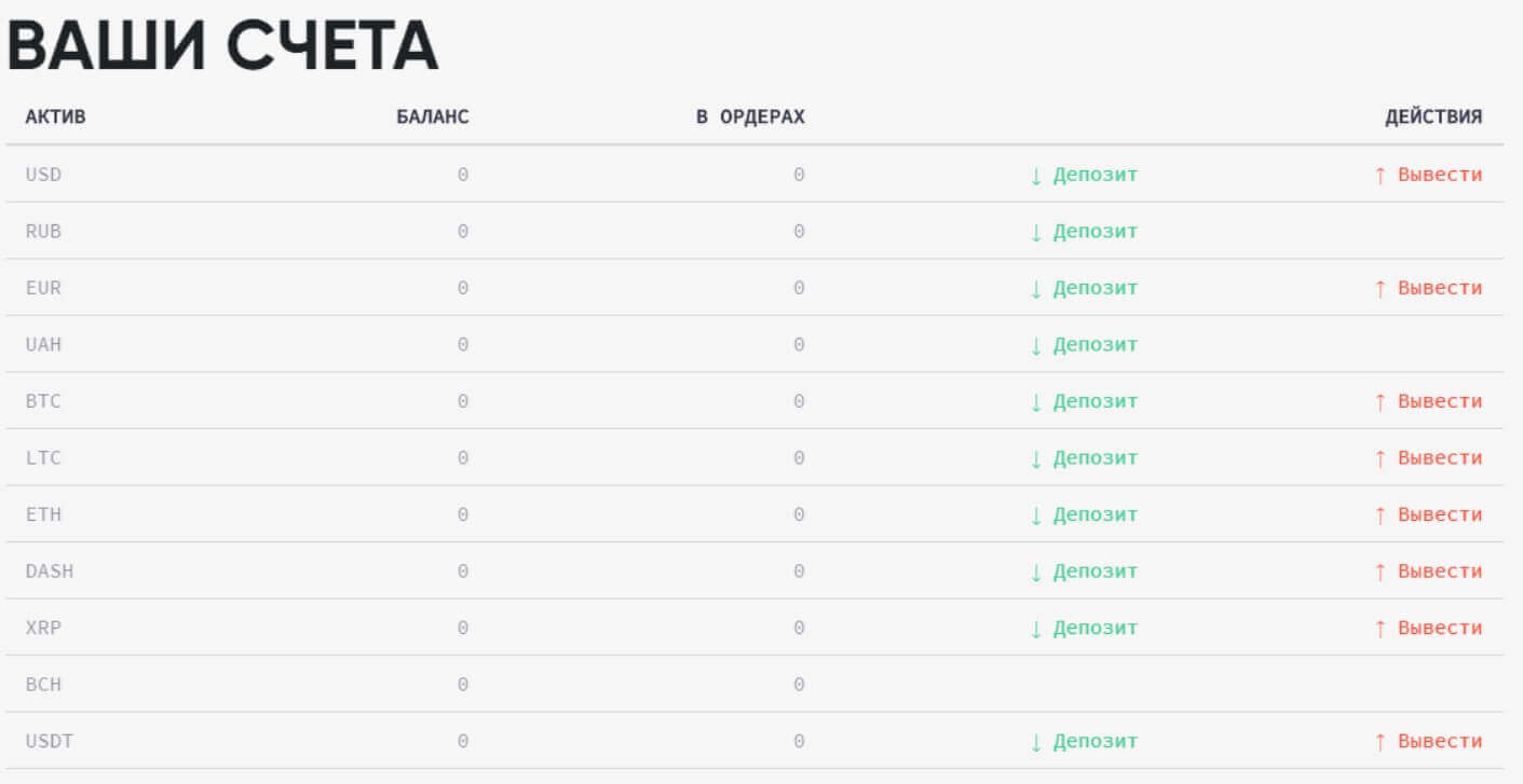 Затем нужно выбрать интересующую валюту и нажать соответствующую кнопку «Депозит» или «Вывести» (стоит отметить, что вывод фиата возможен только для верифицированных аккаунтов). Каждый сможет пополнять или выводить, используя вот такие платежные системы:
