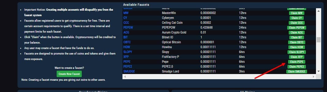 В качестве системы бонусов выступает раздел “Раздача”, в которой можно получать монеты абсолютно бесплатно. Средства можно получить с помощью так называемых кранов. Каждый из них дает разное количество монет для определенной криптовалюты и сети. Чтобы получить монеты, например, криптовалюту Pepe, нужно нажать на кнопку “Claim Pepe”.