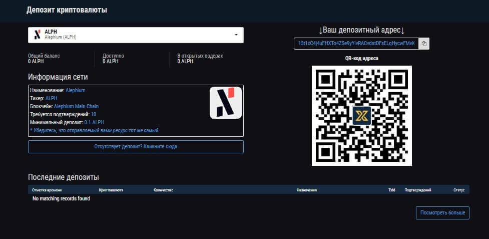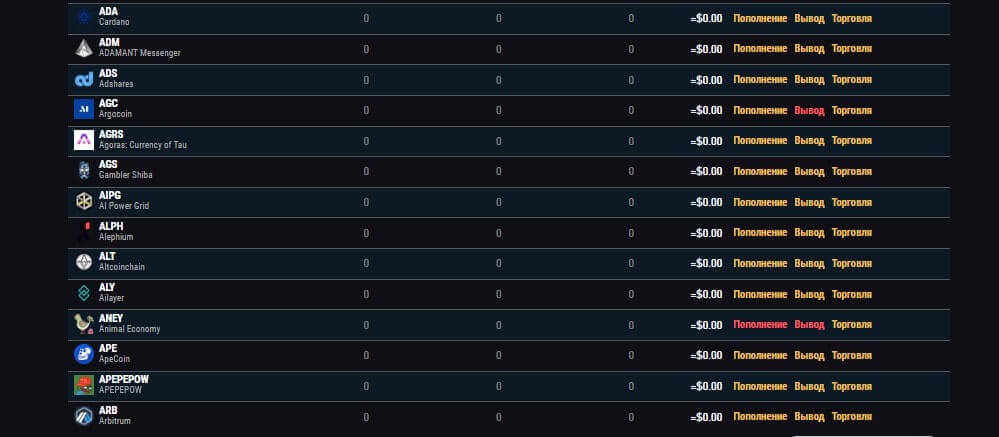 Также можно совершить пополнение, переведя криптовалюту бирже или запросить перевод на свой кошелек. Чтобы сделать это, нужно перейти на страницу “ваш кошелек” в личном кабинете и появиться список поддерживаемых криптоактивов. Не все доступны для пополнения и вывода – если рядом с пунктом обозначено желтым, то тогда она доступна для проведения операции, в случае если выделено красным, то это означает, что временно недоступно.