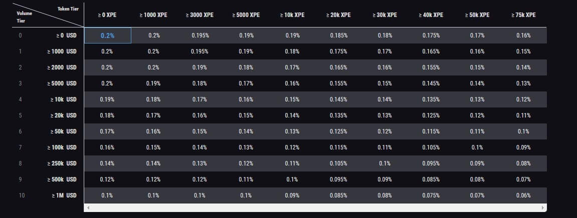 Также можно получить дополнительную комиссию за хранение нативного токена биржи на своём счету. Минимальная комиссия в 0,06% доступна, если пользователь наторговал за календарный месяц на сумму в 1 миллион долларов, а также имеет на счету более 75 тысяч XPE. По таблице, расположенной на официальном сайте можно понять, сколько будет равняться комиссия.