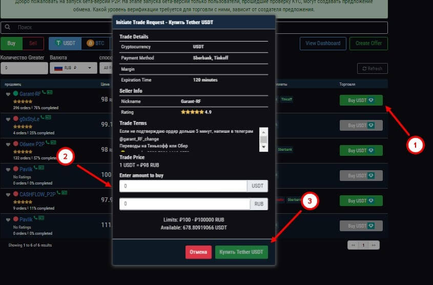 Появиться список предложений от продавцов, где будет указана стоимость монеты, количество, лимит на одного пользователя (минимальный и максимальный). Затем нажимаете на кнопку “Buy USDT”, если был выбран стейблкоин USDT и укажите количество монет (сумма в рублях или другой валюте будет указано во втором поле) и нажмите на кнопку “Купить Tether USDT”.