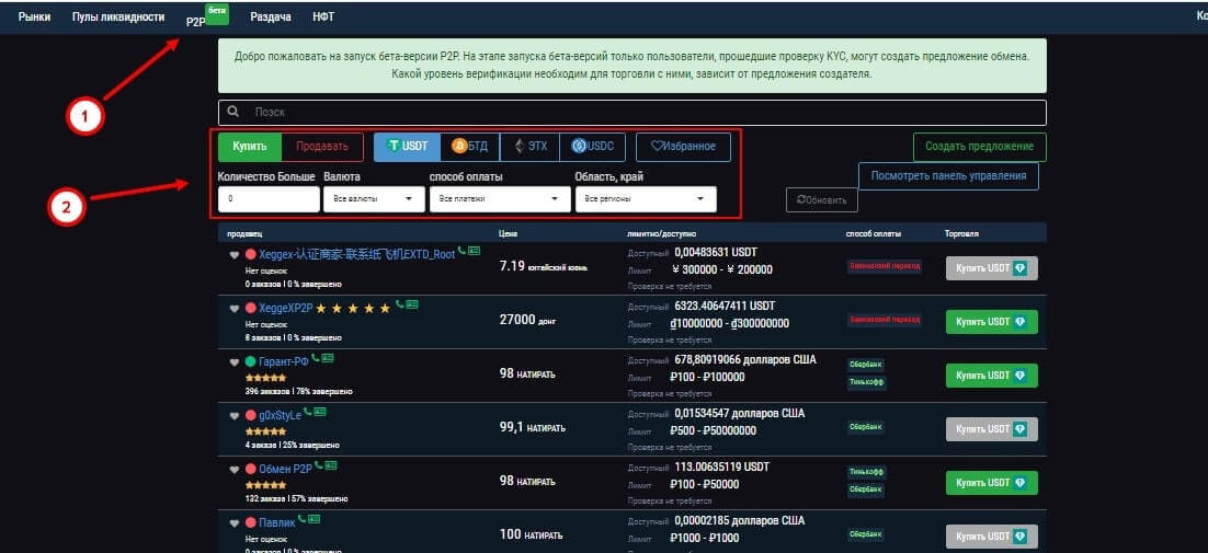 Чтобы пополнить с P2P, необходимо в верхней части страницы нажать на кнопку “P2P”. В открывшейся странице нужно выбрать тип операции (покупка или продажа), криптовалюта, планируемые к покупке – сейчас доступно Tether USD (USD), Bitcoin (BTC), Etherium (ETH) и USD Coin (USDC). Также нужно выбрать количество, валюту, способ платежа и регион (страна).