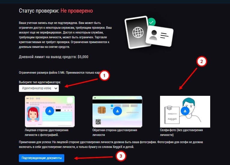 Верификация – не обязательная часть для торговли на сайте биржи Xeggex, однако это повышает защиту аккаунта, а также лимит на вывод средств. До использования функции можно снимать средства с баланса на сумму не более 2 000 долларов, а после лимит будет увеличен до 5 000. Процесс не займет у клиента много времени, однако позволит наиболее комфортнее торговать криптовалютным активами.