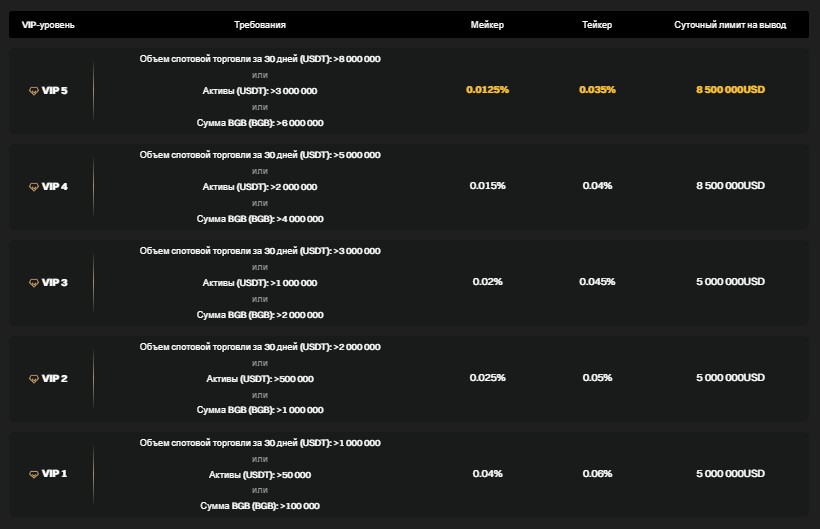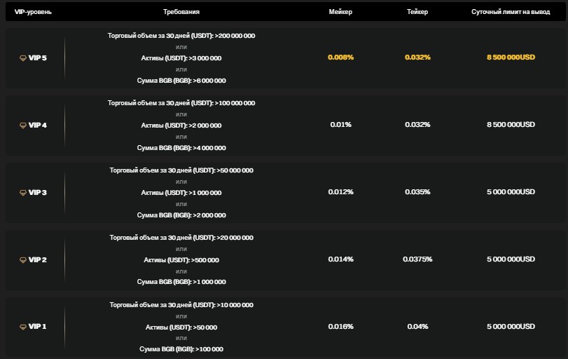 Стандартная комиссия для мейкера и тейкера при торговле на споте – 0,1%, однако при использовании токена BGB, трейдеры получают скидку на 20%, тем самым она уменьшается до 0,08% за сделку. Однако имеется VIP-программа, с помощью которой можно уменьшить комиссию. Условия получения и размер комиссии можно найти на фотографии ниже.