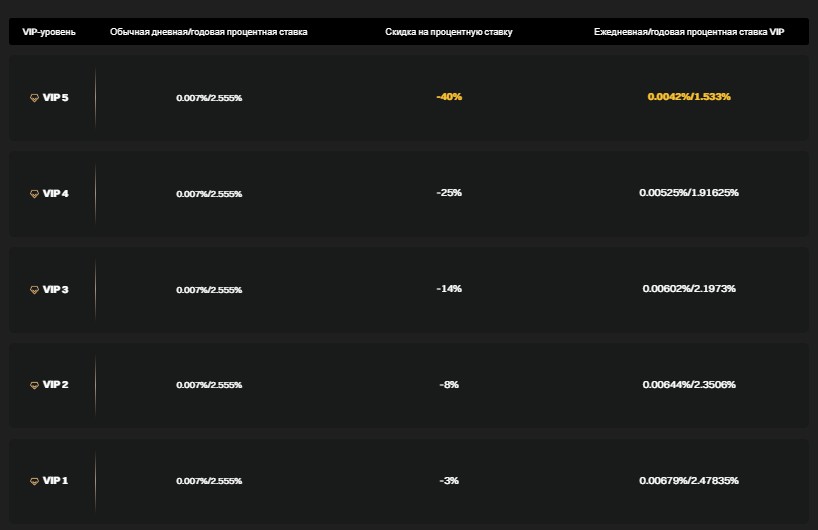 За каждый день использования средств биржи, компания взимает определенную процент. Для каждой валюты он разный, например, стандартная для кросс-маржи на пары, где участвует BTC она будет равняться 0,007% в сутки и 2,555% годовых. Но, достигнув определенного уровня, каждый сможет уменьшить процент на 40%. В качестве примера возьмем тот же BTC.