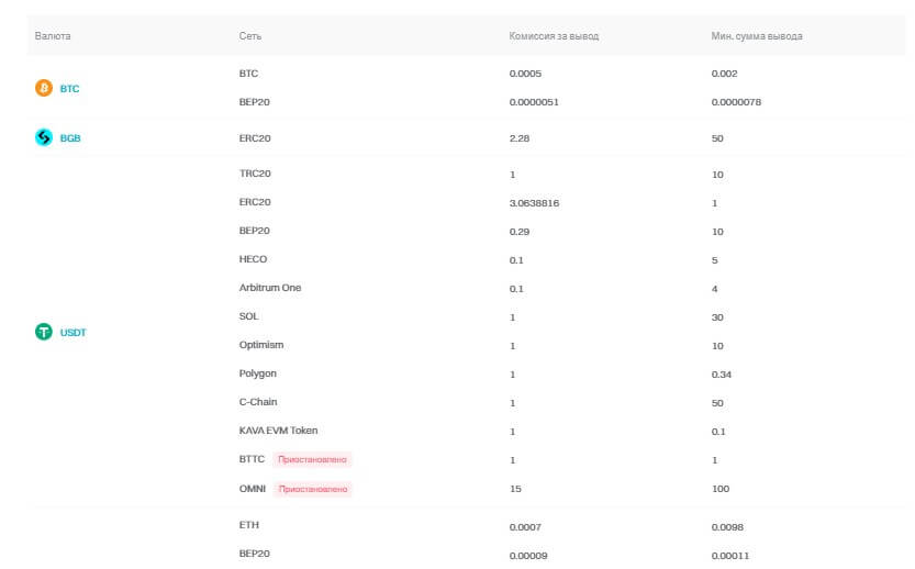 Комиссия, связанная со снятием или пополнением средств на счет является фиксированной и будет зависеть от конкретного цифрового актива и сети, которую трейдер хочет вывести со своего личного счета. Размер комиссии указывается в абсолютных числах, а не в относительных (процентах), как при комиссии на торговлю.