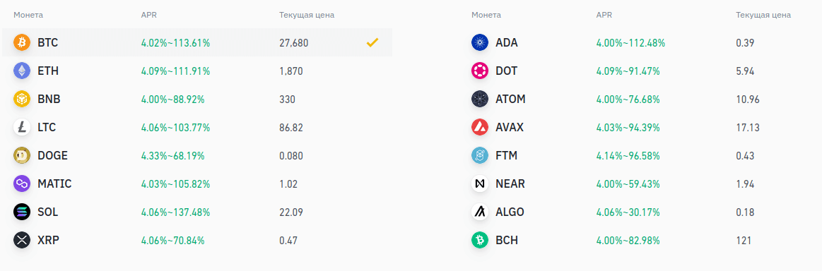 Как и в случае с покупкой, дополнительные вознаграждения обеспечиваются за хранение стейблкоинов на депозите. Ниже представлены имеющиеся на Binance предложения по двойным инвестициям на момент публикации материала. APR — уровень предполагаемой доходности, варьирующийся в зависимости от выбранных условий. Для каждой сделки можно выбирать сроки, уровни страйк-цен, а также участвующие в паре монеты.