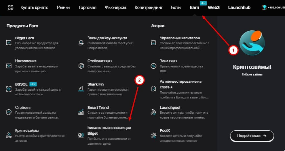 В верхнем меню криптовалютной биржи на сайте или в приложении выберите раздел “Earn” – “Бивалютные инвестиции BitGet”.