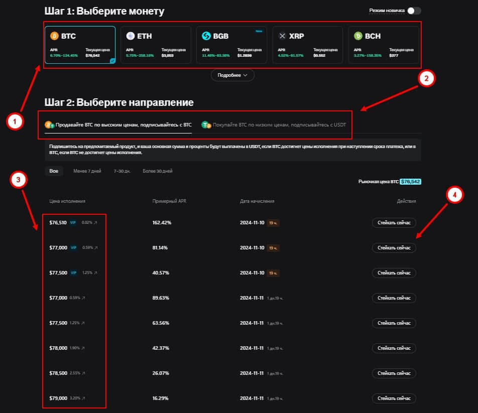 На странице появится несколько этапов. В начале нужно выбрать монету: доступно BTC (BitCoin), ETH (Ethereum), BGB (BitGet Token), XRP (Ripple) и BCH (BitCoin Cash), затем направление: продажа криптовалюты по высокой цене («Исполнение при росте») или покупка монеты по низкой цене («Исполнение при падении»), сумму и срок исполнения. Для оформления нажмите на кнопку «Стейкать сейчас».