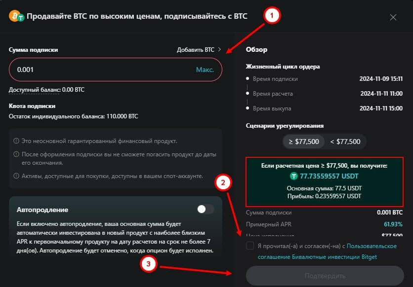 Допустим, нынешняя цена BTC равна 76 600 USDT за монету. Пользователь решил выбрать продукт с ценой исполнения в 77 000 USDT, вложив 0,001 BTC со ставкой 62% годовых на сутки. В этом случае при достижении или превышении цены от значения “цена исполнения”, то в таком случае пользователь получит 77,75 USDT, где 0,25 USDT – доход за исполнение. Если же цена не достигнет “цену исполнения”, то пользователь получит 0,00100327 BTC, где 0,00000327 BTC доход, получаемый с процентной ставки.