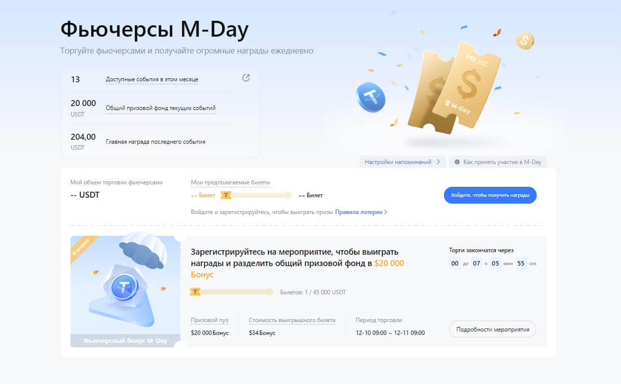 Кроме стандартных бонусов пользователи могут принимать участия в розыгрышах или конкурсах. Одним из разделов для получения аирдропов считается M-Day. Задача пользователей торговать в определенный период времени и получат билеты за это действие. Сумма призового пула распределяется на три части: