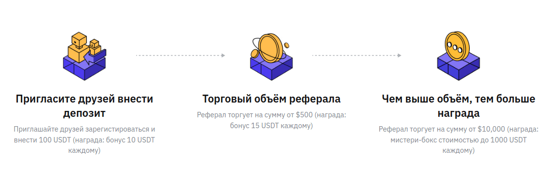 - Если же новичок показывает оборот 10 000$ и более, оба получают по мистери-боксу с наградой до 1000USDT. Этот подарок необходимо активировать в течение 30 дней с момента получения.