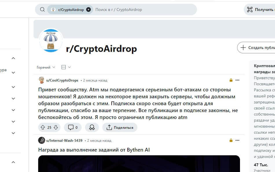 - Кроме того, сообщества и форумы, такие как Reddit, особенно субреддиты, посвященные айрдропам и криптовалютам, являются ценным источником информации. Пользователи здесь делятся свежими airdrop, своими опытом и рекомендациями, что делает эти форумы не только полезными для получения информации, но и для обмена мнениями и советами.