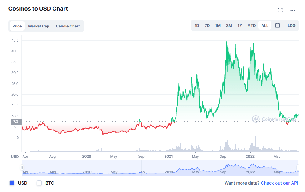 Один из ярчайших примеров подобной ситуации – токен Cosmos. Его цена на максимуме демонстрировала показатели в $43 за единицу. Однако к моменту написания материала в середине 2022 года упала до $10. Даже с расчетной доходностью в 30% за 120 дней (90% в год) для полного возврата полученных потерь инвесторам необходимо продолжать стейкинг как минимум следующие 4 года. И это только для выхода «в ноль».