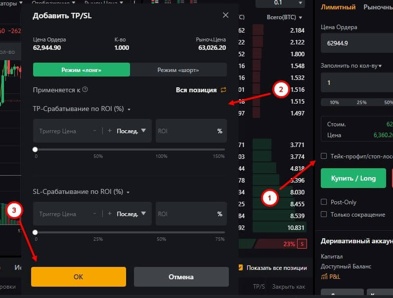 - При открытии позиции следует указать цену входа (если рассматривается лимитный заказ) и размер позиции. Затем подтвердите и выполните свой собственный заказ.