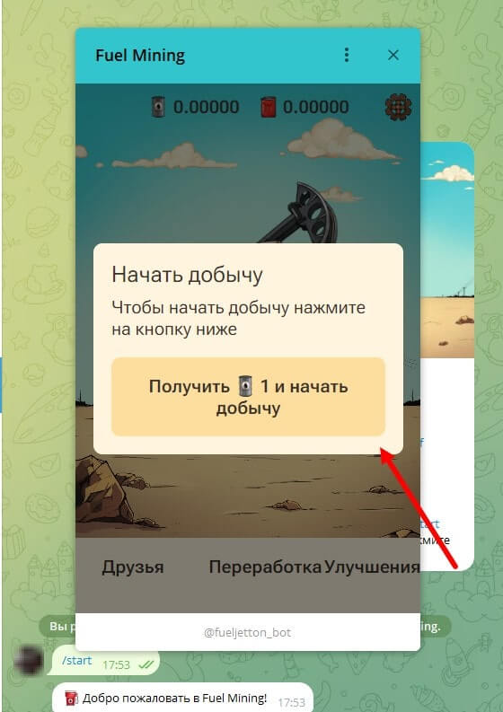 Загрузится мини-приложение. Для продолжения нажмите на “Получить 1 и начать добычу”.