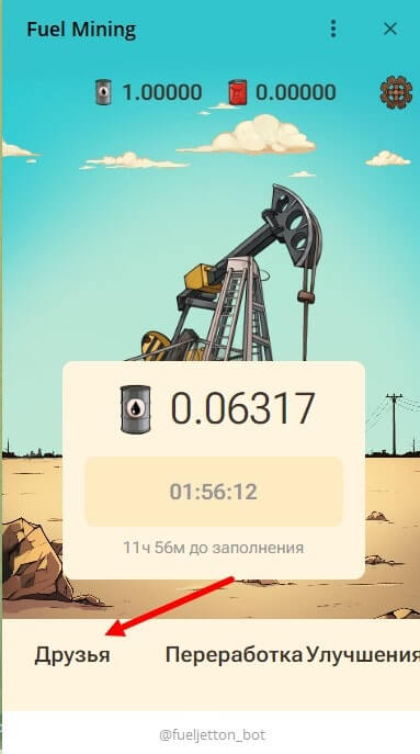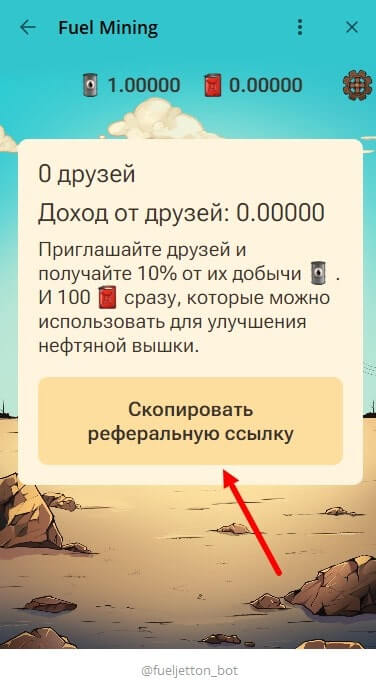 Ссылку для приглашения друзей можно скопировать нажав на кнопку “скопировать реферальную ссылку”. После перехода каждый пользователь будет получать бонус, в размере 10% от добытой нефти и 100 бензина, используемые для улучшения нефтяной вышки.