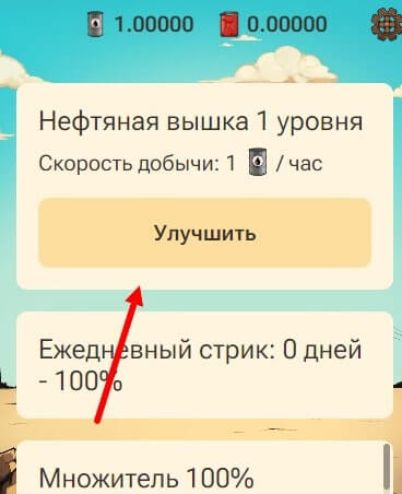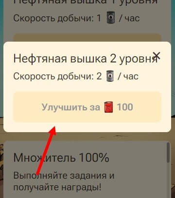 Нажав на кнопку “улучшить” появится стоимость, в размере 100 канистр на первом уровне. Повышения последующих уровней будет стоить вдвое дороже (200, 400, 800 канистр), как и добыча будет увеличена в 2 раза больше – 4, 8, 16 бочек нефти и т.д.